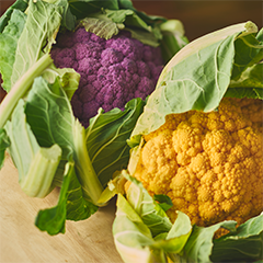 黄色や紫のカリフラワーは、お料理を華やかにしてくれます。生食も可能ですが、茹でるとさらに鮮やかな色になります。生のままサラダやピクルスに、炒め物や和え物にもおすすめです。