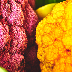 黄色や紫のカリフラワーは、お料理を華やかにしてくれます。生食も可能ですが、茹でるとさらに鮮やかな色になります。生のままサラダやピクルスに、炒め物や和え物にもおすすめです。